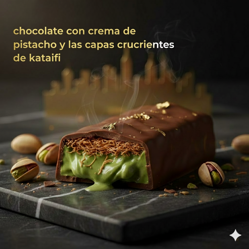 Crema de pistacho combinada con una capa crujiente de catafi, creando un chocolate gourmet y elegante