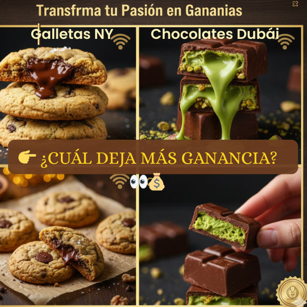 Las Galletas estilo New York, famosas por su tamaño, textura y rellenos irresistibles, se unen con la elegancia y lujo de los Chocolates estilo Dubái, reconocidos por su acabado premium y sabores exóticos.